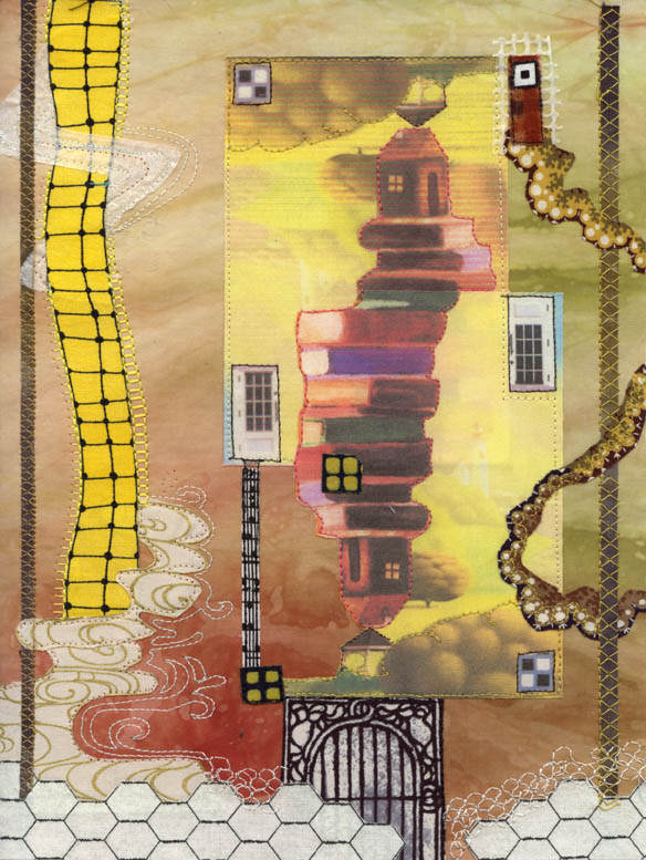 I made this FAB Collage and sent it to my accountant. I wasn't really thinking of taxes when I made it, but I think it was perfect for him!. I don't usually combine paper with these, but somehow the Japanese Rice paper seemed to be perfect for the upper clouds on the left. After all, these little beauties will never be washed! Once I am satisfied with the design I fuse all the fabric down. Then I stitch every piece of fabric down (I don't trust the fuse). Then I embellish with decorative machine stitching, hand stitching, yarns, and beads. Not too much, just what the design calls for.